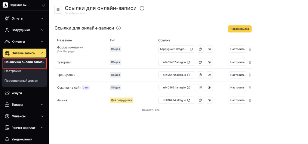 - В режиме Администрирование перейдите в раздел Онлайн-запись > Ссылки на онлайн запись.