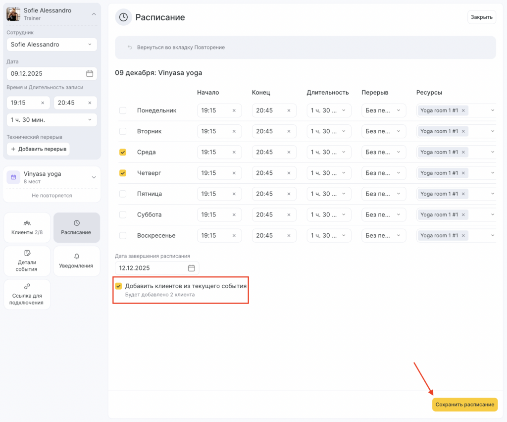 Чтобы добавить клиента в серию групповых событий, необходимо сначала создать расписание для этих событий. Сделать это можно из окна события на вкладке «Расписание».