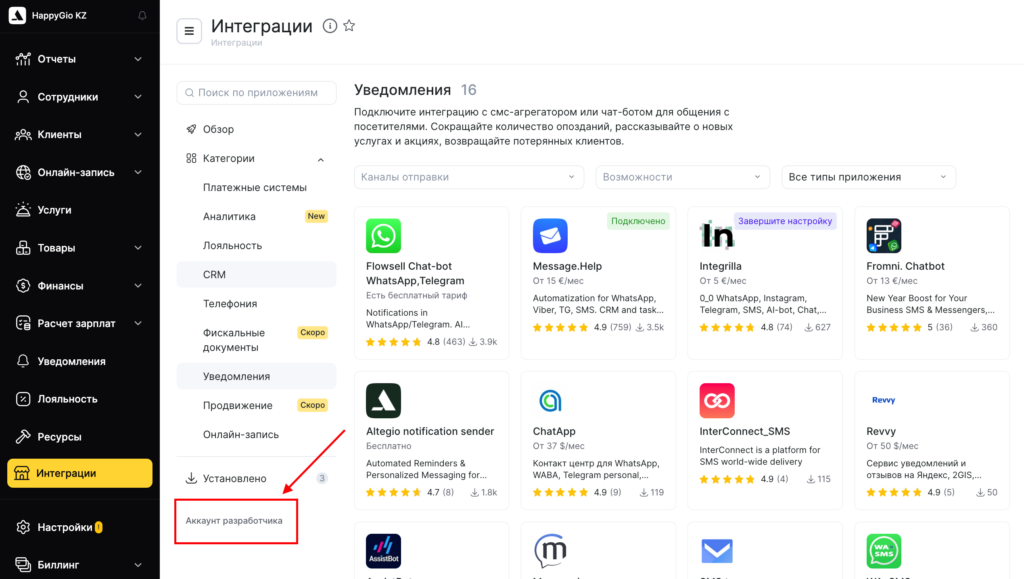 - Перейдите в аккаунт разработчика. Это можно сделать в режиме Администрирование в разделе Интеграции > Аккаунт разработчика или перейдя по ссылке.