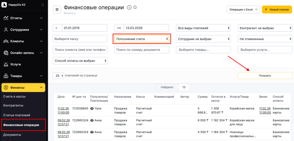 - Перейдите в раздел Финансы > Финансовые операции (режим Администрирование), найдите необходимую операцию. Для быстрого поиска можно воспользоваться фильтром по статье платежа Пополнение счета, выбрать необходимые даты, также ввести имя/номер телефона клиента при необходимости, затем нажать на кнопку Показать.