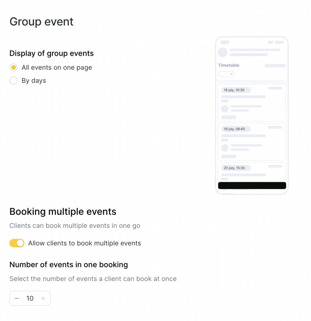 Select how many events a client can book at once: from 1 to 10. This setting does not affect the number of spots in a single event booking — it only defines the number of events for simultaneous booking. The number of spots in one booking is controlled by a separate appointment journal setting Allow occupying multiple spots within one booking (read more here).