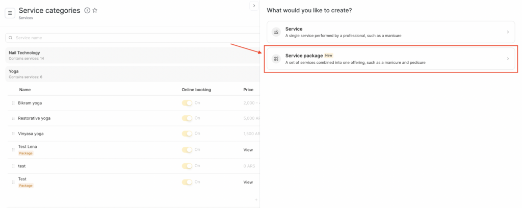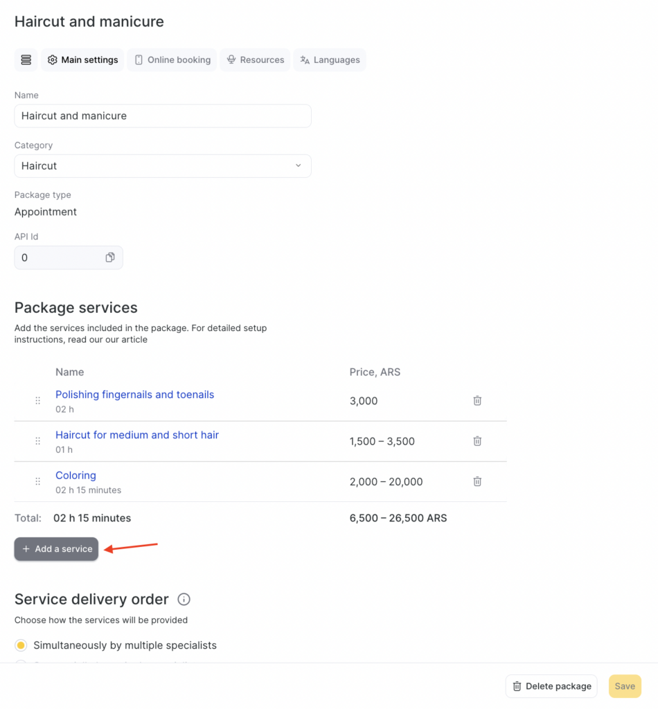 Packages can be sequential or parallel and can include from 2 to 10 services. Read more below in this article about how it works and how to configure it. You can create package services in a location or in the chain interface, configure online booking for them in a location, and also create and edit package appointments in the Appointment Calendar.