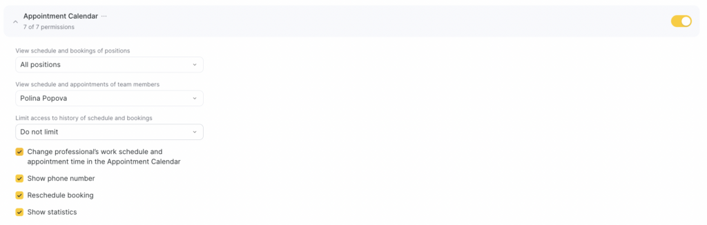 For example, a receptionist will be able to see schedule history without limits, while a service provider will not be able to see past appointments.