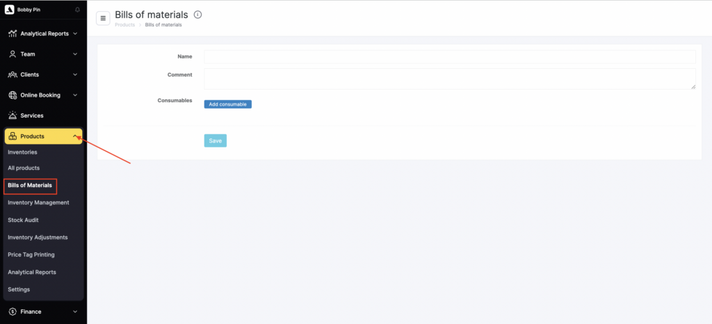 Before setting up bill of materials, make sure the required list of items exists in your inventory catalog (Products > All products).