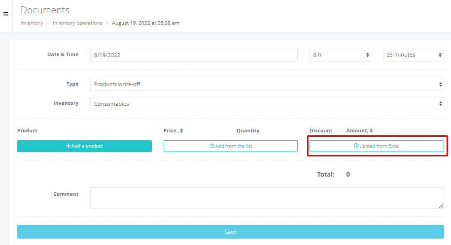 After that, a new window will open where you can specify the date and time for the inventory operation (the current date and time will be selected by default). Next, select the Storage from which you want to write off the products and add the products to the operation. You can add products in one of three ways: