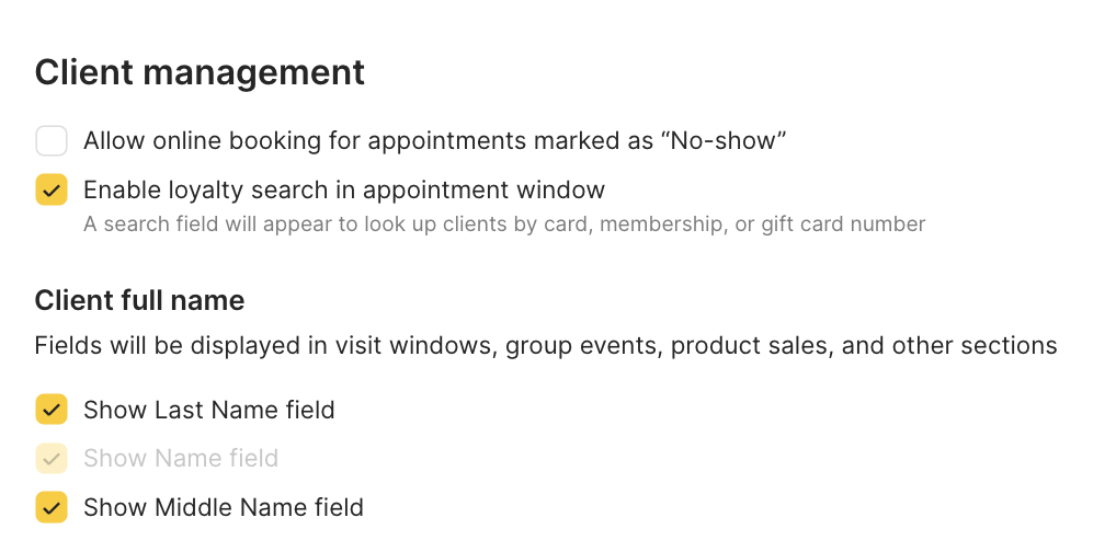 - Client full name – enable additional fields for the client’s last name and/or patronymic. More details on this setting can be found here.