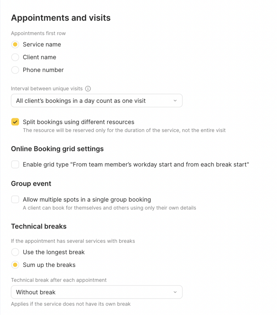 - Split bookings using different resources – when creating an appointment for multiple services, resources for each service are booked for the entire appointment time. Tick this option so that the system creates separate appointments for each service, booking resources only for the duration of that specific service.