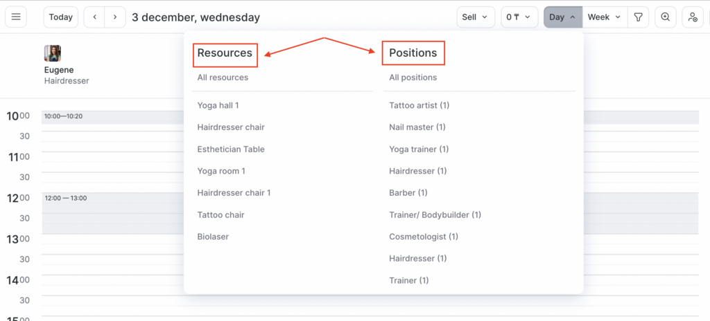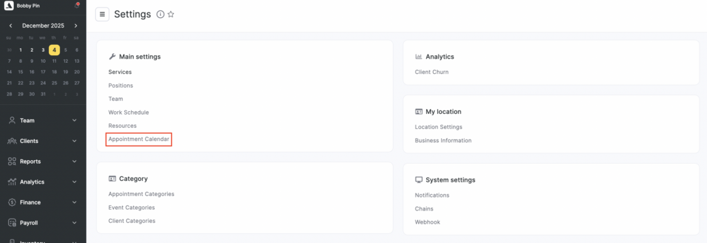 The Appointment Calendar is the main tool for the administrator. In the Calendar, you can view all visits, resources, the client card, their full visit history, preferences and statistics, as well as sell products. You can configure the interface of the Calendar in Settings > Main settings > Appointment Calendar — select the required options and click Save.
