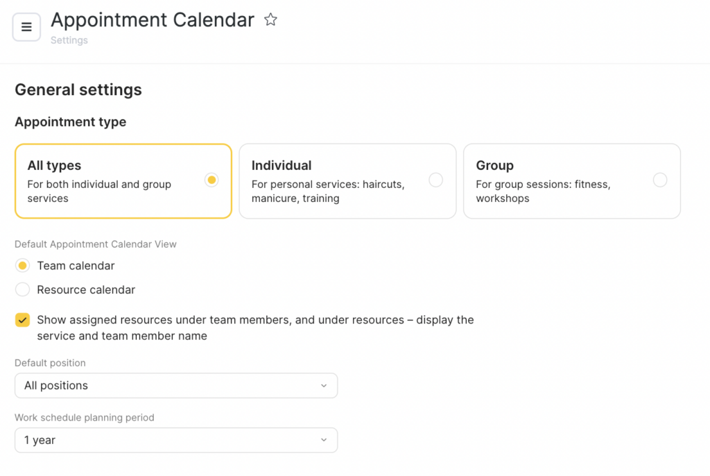 Default Appointment Calendar view – select which schedule will be displayed by default: Team schedule or Resource schedule. If you selected Team schedule, specify which position’s team members will be shown by default. For more details on configuring positions, see the Team member positions article. If you selected Resource schedule, specify the default resource. For more details on resources, see the Resources article.