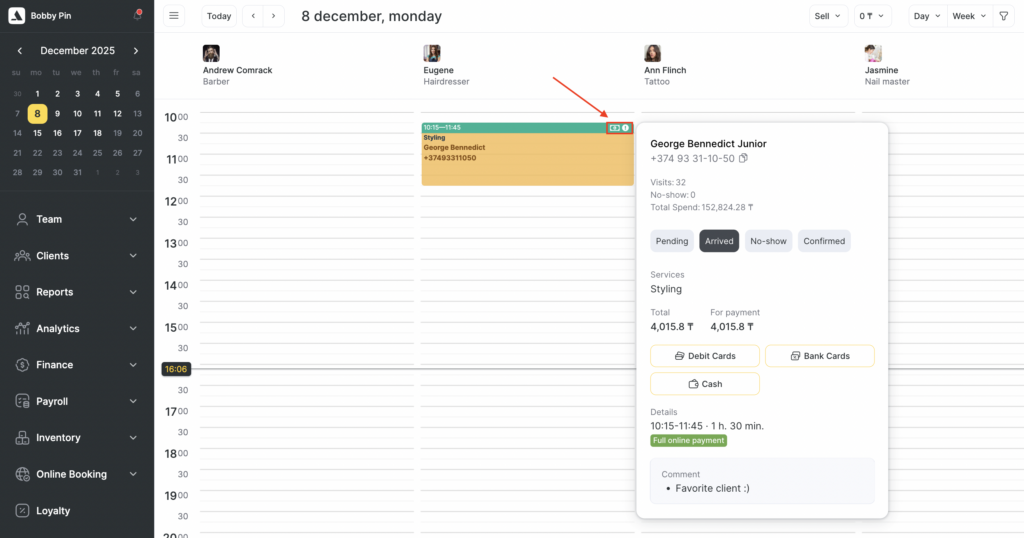 - Any staff member: This category indicates that the client skipped the selection of staff members when making their appointment, and the booking was created for a random unoccupied professional. If needed, you can easily reschedule this booking for another team member.