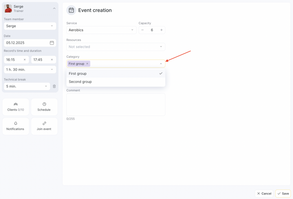 In Altegio, there are no default categories for events. However, you can easily create your own categories to help you tag and organize your group bookings.