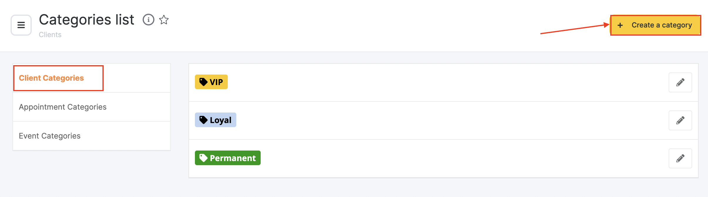 Go to the Clients — Client Categories section and click the Add a category button. Indicate the name of the category and select the color for the tag, click Save. After this the category will appear in the list.