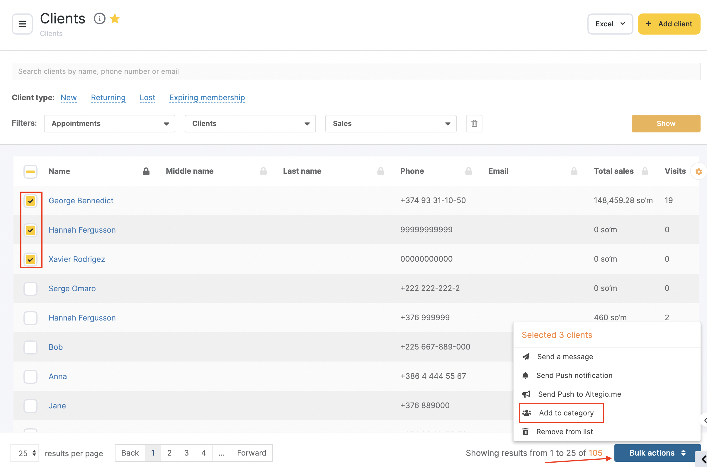 - Click the Bulk actions button and select Add to category if you want to add all clients to a category;
