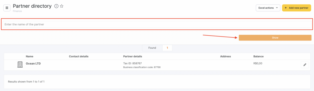 You can add, configure, and delete suppliers and partners (see the Creating and configuring suppliers and partners article). In this section, you can access a list of all your suppliers and partners, including their name, contact information, company details, and current balance for transactions with your supplier or partner. To view the information on a specific supplier or partner, simply enter their name and click on the Show button.