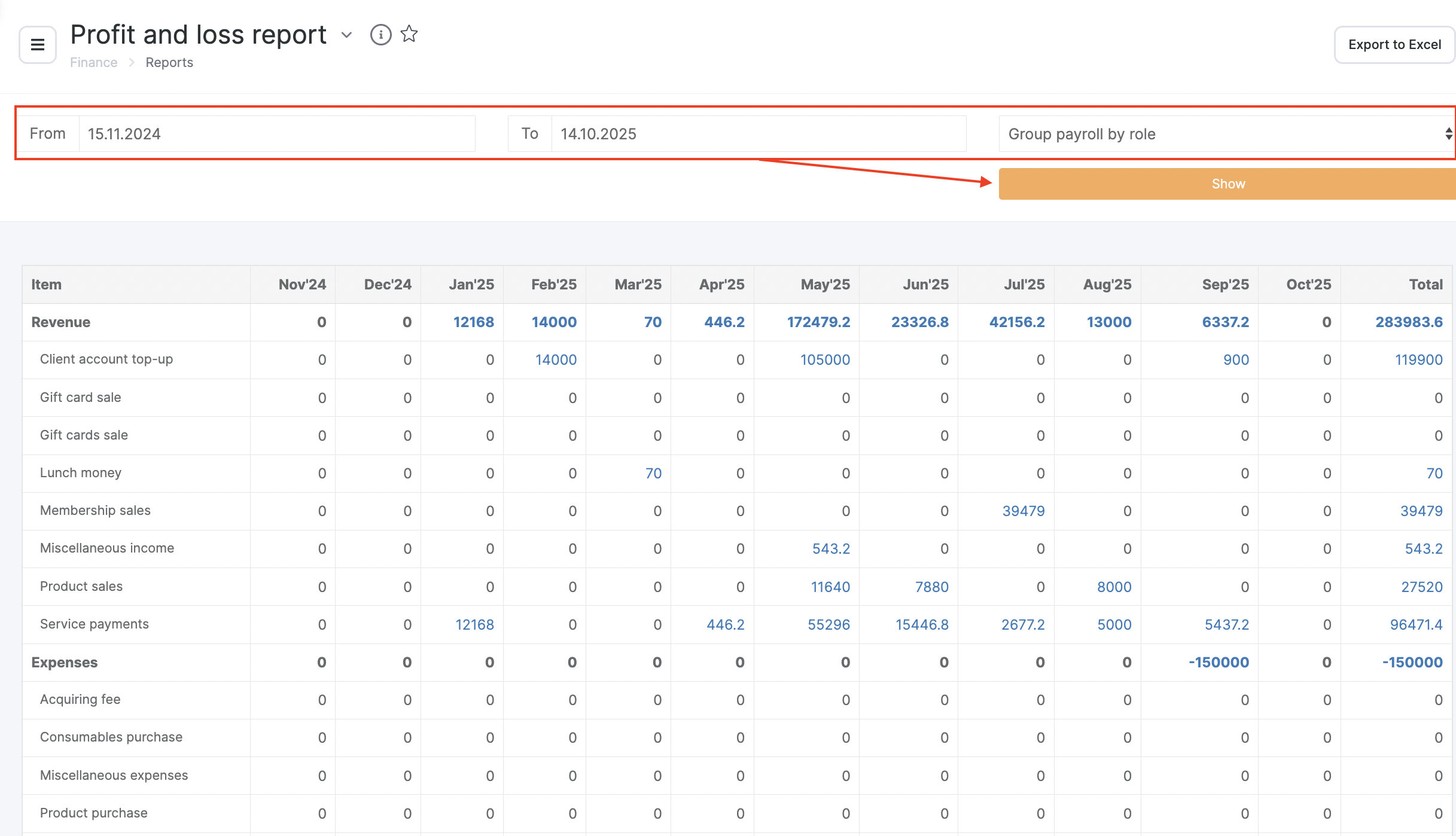 The Profit and Loss (P&L) report provides a comprehensive overview of income and expenses for each month throughout the year. It allows you to track the progression of profits and losses over time. The report consolidates the same data as the Financial Report (period report), but offers additional features and filters for in-depth analysis. Read more in this article.