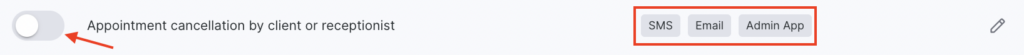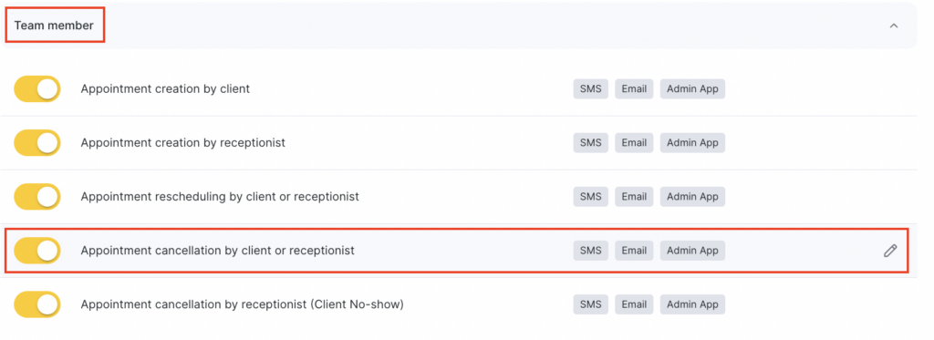 - In the Team member block, select Appointment cancellation by client or receptionist by clicking the notification name or the pencil icon.