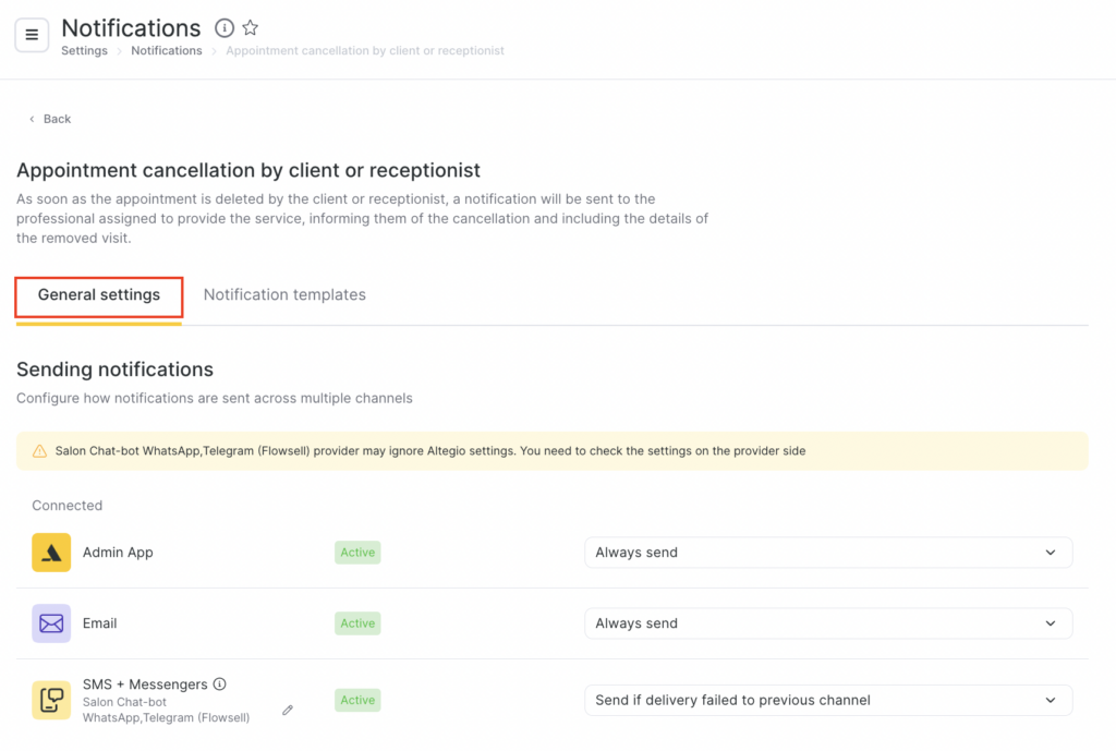 - On the General settings tab, configure how notifications will be sent via multiple channels. For more details about multi-channel notification scenarios, see the article. Available channels: