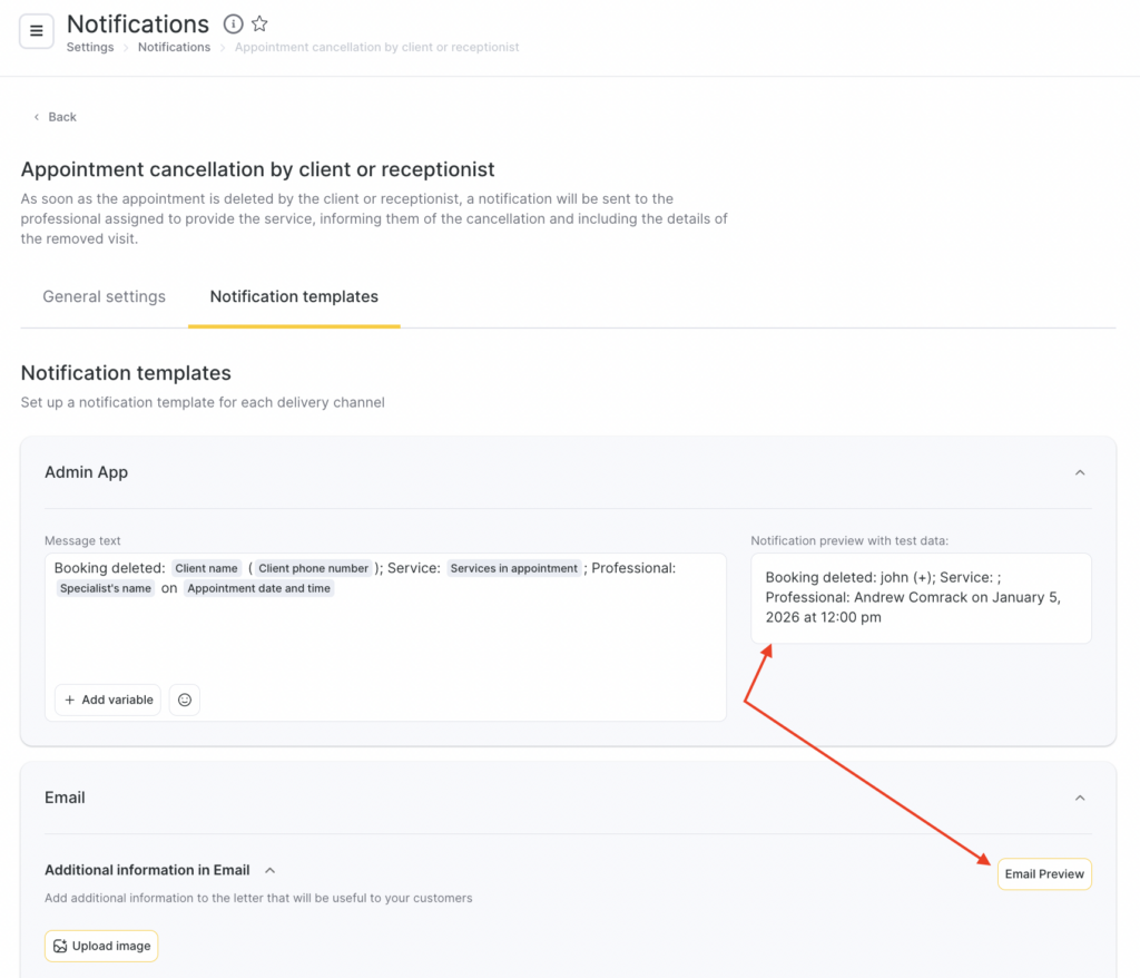 For all notification templates, preview is available — how the message will look when sent to a client, team member, or receptionist, taking variables into account.