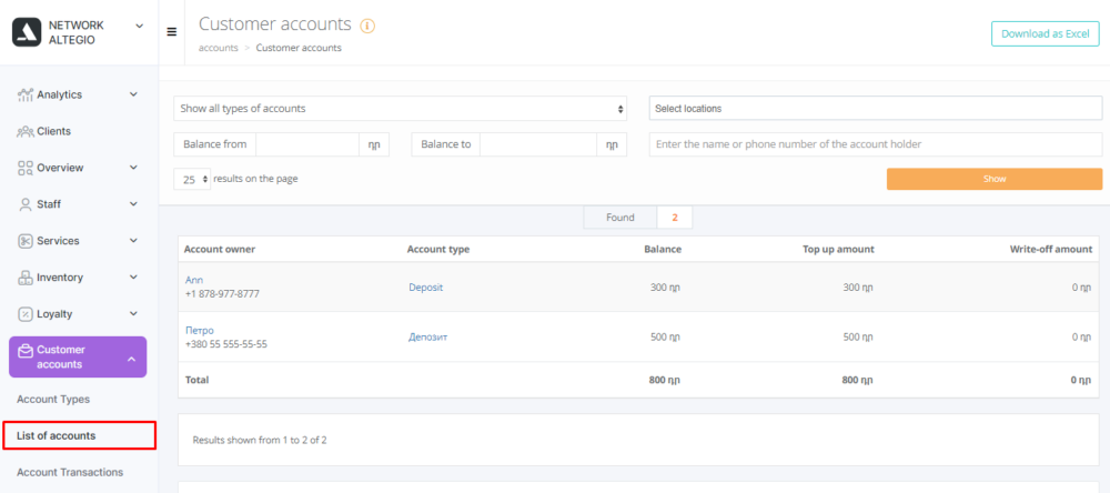 It is possible to transfer customer account data from another system by exporting from Excel, to do this, contact your personal Altegio manager.
