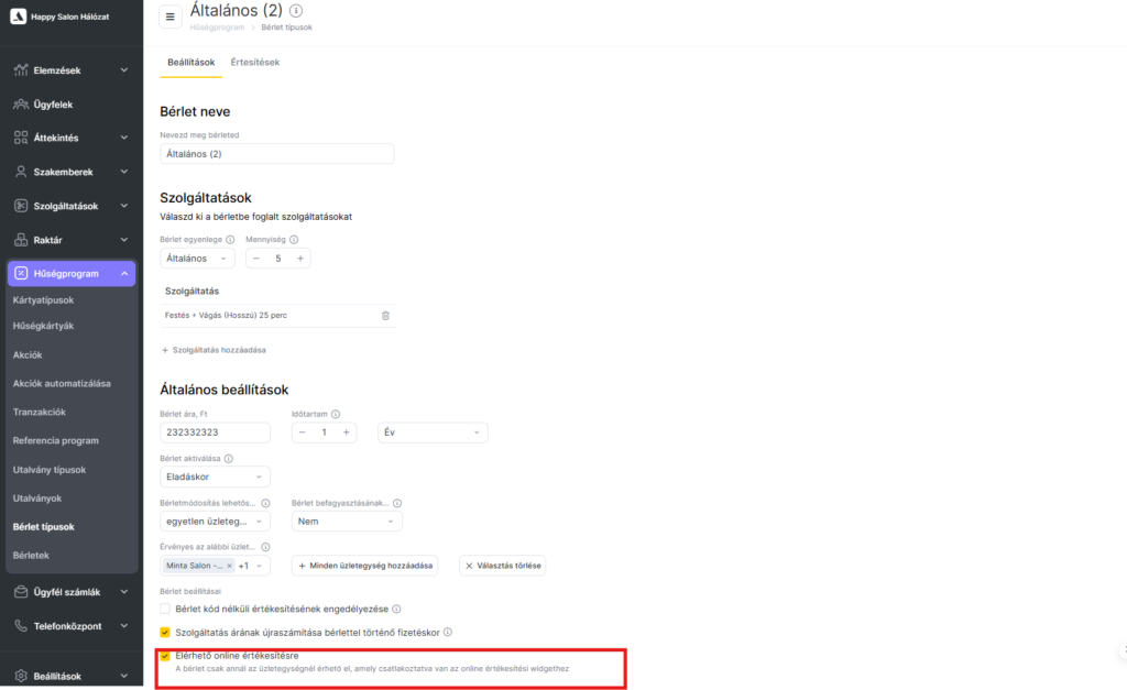 1. Lépj a hálózati interfész «Hűségprogram» > «Bérlet típusok»/«Utalvány típusok» menüpontjára.