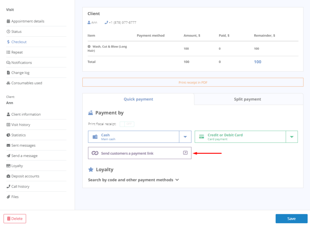 Depois de configurar um provedor de pagamento online, você pode ativar o Pagamento por visitas através do método de link. Você pode ativá-lo ou desativá-lo na seção Finanças — Pagamento sem dinheiro. Se esta opção estiver ativada, você pode copiar o link na guia Checkout na janela Reserva e enviá-lo ao cliente da maneira que for conveniente para você.