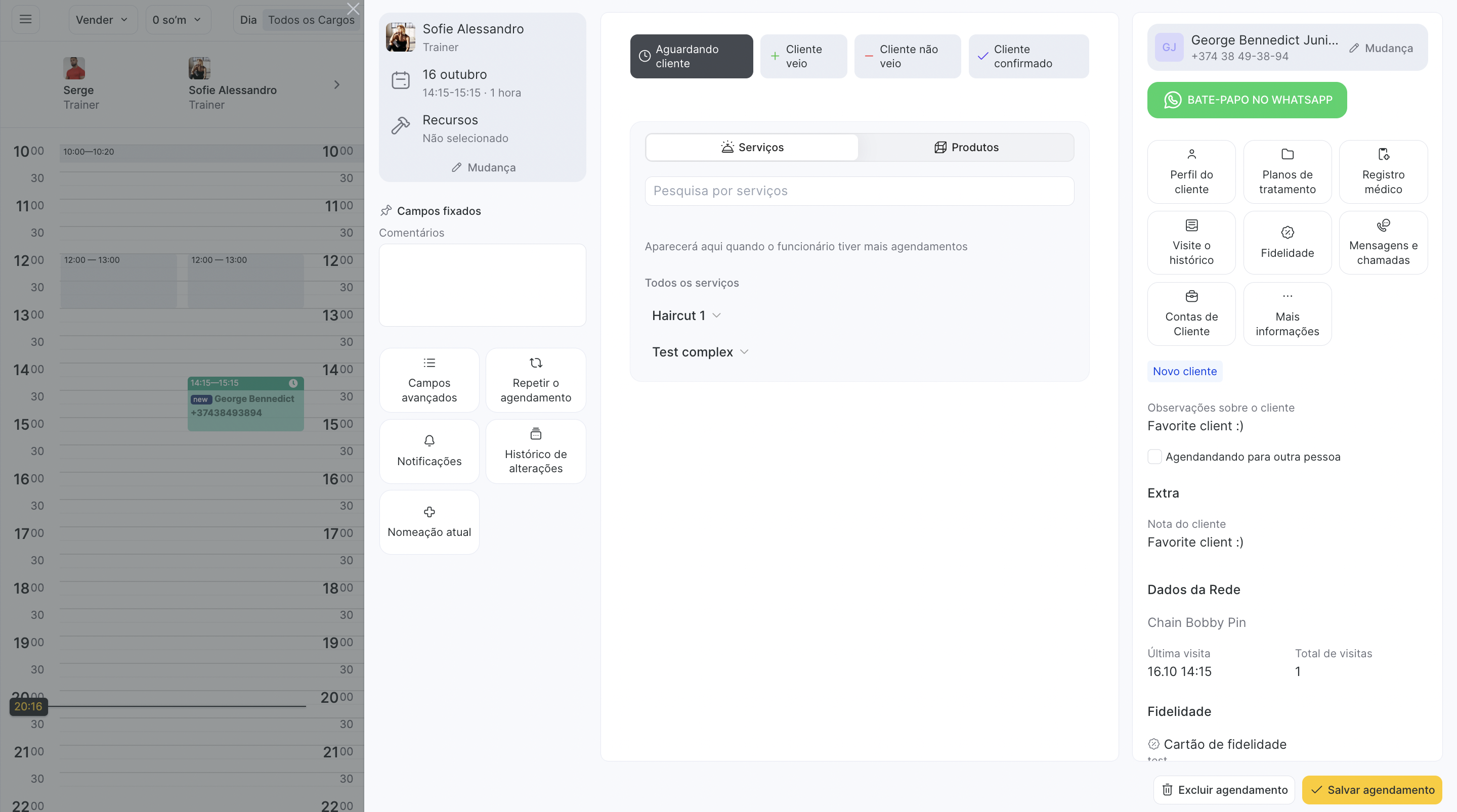 Seção Direita: Dedicada inteiramente à gestão de clientes. Isso inclui adicionar um cliente ao agendamento, visualizar informações do cliente e acessar seções como “Histórico de Visitas”, “Fidelidade”, “Estatísticas”, “Mensagens e Chamadas”, “Contas de Depósito” e “Arquivos”.
