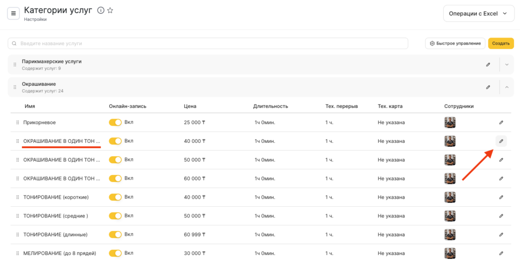 - На открывшейся странице нажмите на название услуги или на карандаш, чтобы перейти к настройкам.