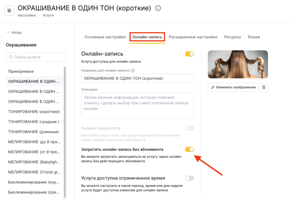 - Перейдите на вкладку Онлайн-запись и пролистайте страницу вниз. Если услуга индивидуальная, включите опцию Запретить онлайн-запись без абонемента.