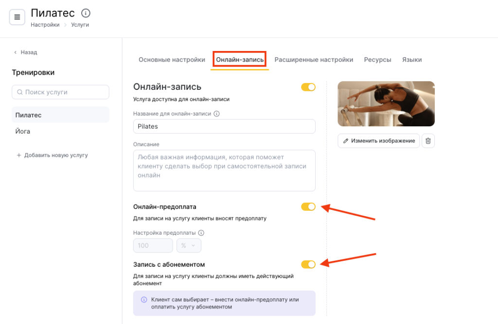 Если в вашем филиале включена обязательная или необязательная оплата для индивидуальных услуг, при настройке услуг вы можете выбрать — включить онлайн-предоплату или запретить онлайн-запись без абонемента, одновременно обе настройки выбрать нельзя.
