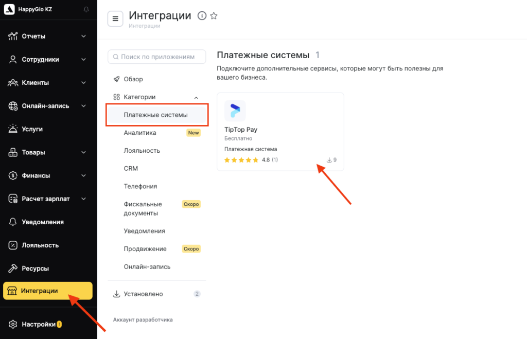 - Для подключения TipTop Pay в Altegio перейдите в режим Администрирование в раздел Интеграции > Маркетплейс > Платежные системы > TipTop Pay