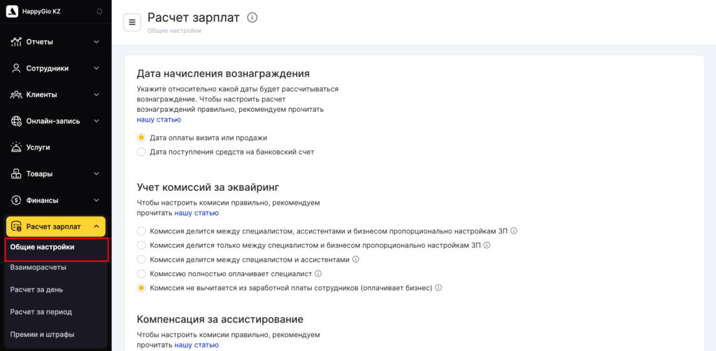 В этом разделе, помимо настроек компенсации ассистентов, также задаются такие настройки, как Дата начисления вознаграждения и Учет комиссии за эквайринг. Эти настройки позволяют точно управлять принципами расчета зарплаты и учитывать особенности оплаты в вашем бизнесе.