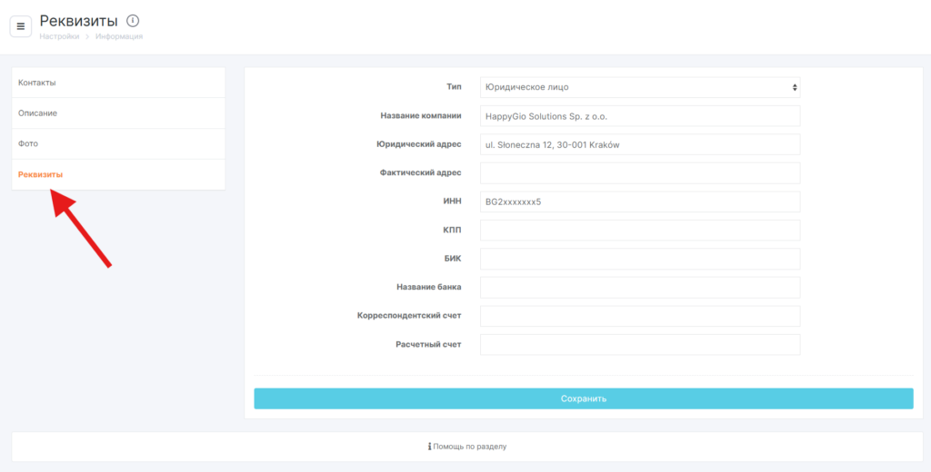 После редактирования контактной информации, описания и фото добавьте реквизиты компании.