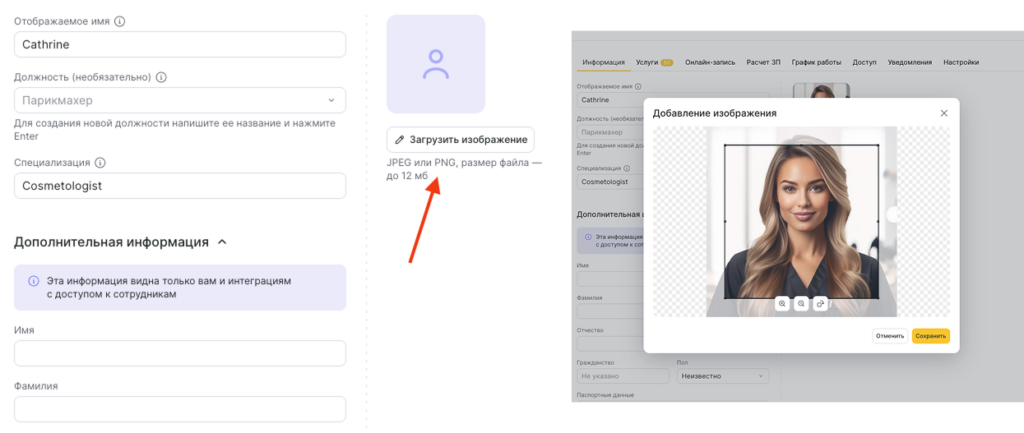 - В открывшемся окне заполните необходимы поля введите имя сотрудника. Отображается в графике работы и записях.