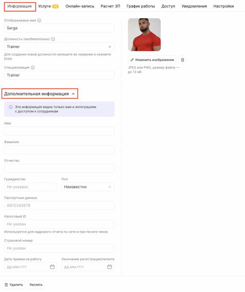 2. Выберете сотрудника, нажмите на его имя. В первой вкладке «Информация» разверните блок «Дополнительная информация». Заполните необходимые данные.