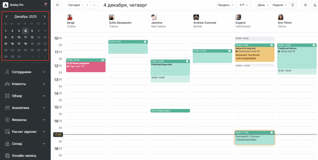 С журналом могут одновременно работать несколько пользователей: администраторы ведут журнал, а сотрудники могут просматривать свое расписание и записи. В журнале хранятся все актуальные записи и события: созданные администратором через журнал записи и клиентами через виджет онлайн-записи.