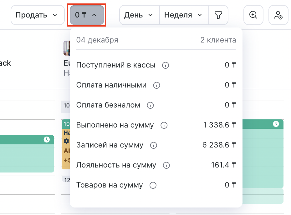 - Нажмите кнопку с суммой справа, и вам откроется финансовая статистика за день: сколько денег поступило наличными и безналом, на какую сумму создано записей, какая часть суммы была оплачена лояльностью и сумма предусмотренных скидок.