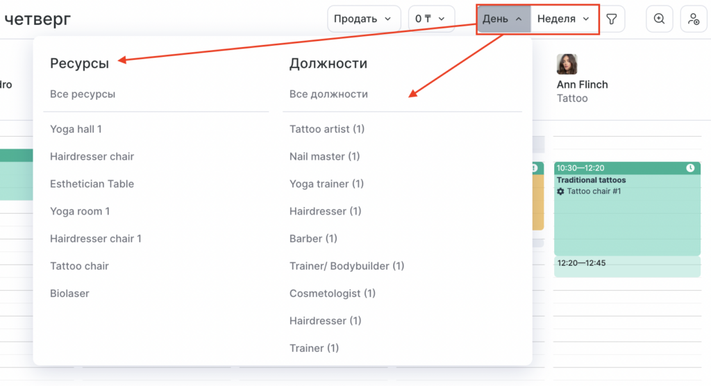 В режиме День можно просматривать расписание сотрудников по всем должностям или по какой-то одной, и так же по ресурсам.