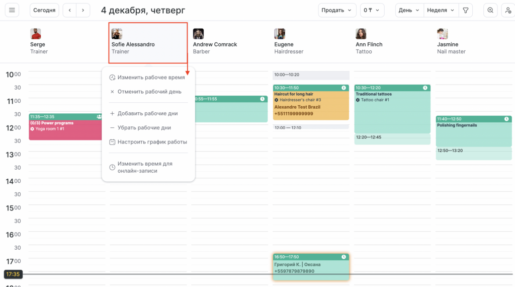 - Выберите свободное время у нужного сотрудника и нажмите Новый сеанс.