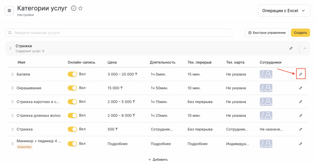 - Откроется список услуг, нажмите на название услуги, к которой нужно прикрепить ресурс, или на кнопку редактирования услуги.