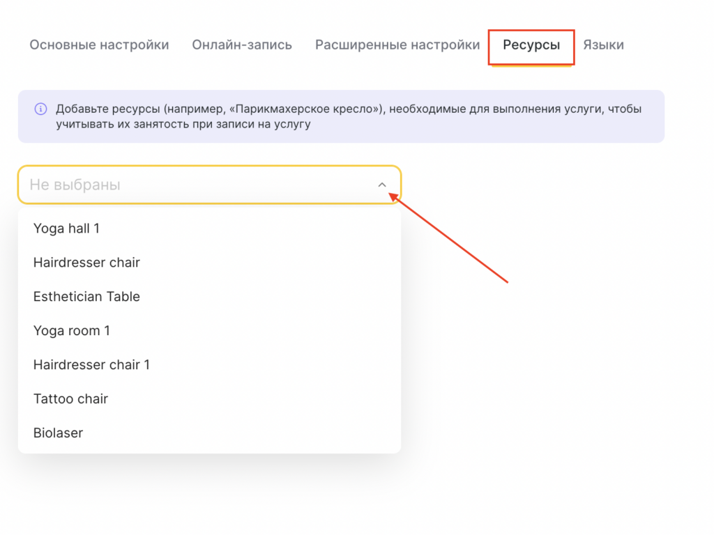Ресурсы будут бронироваться при записи, только если они прикреплены к услугам.