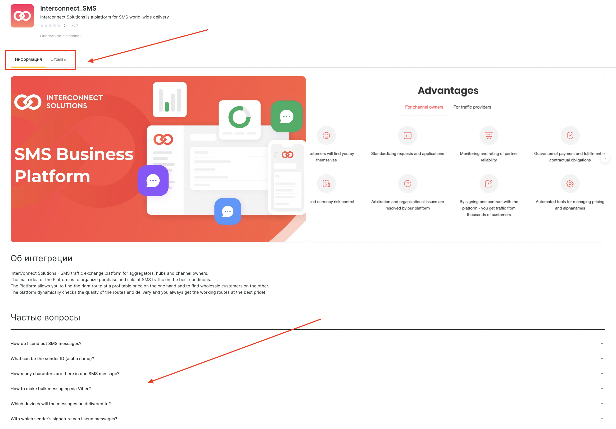 Нажмите на иконку сервиса, на открывшейся странице ознакомьтесь с информацией о функционале SMS-агрегатора/чат-бота.