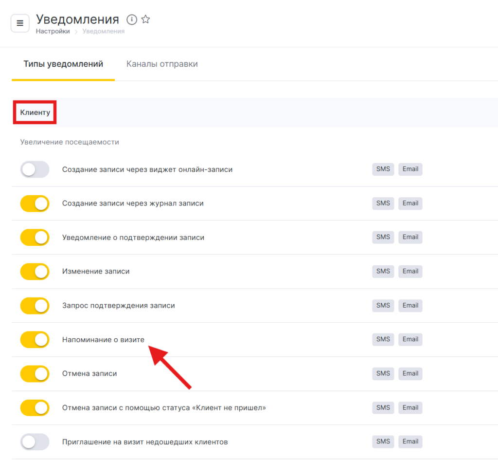 - В блоке Клиенту выберите тип Напоминание о визите. Чтобы перейти к редактированию условий, сценариев отправки и шаблонов, нажмите на название уведомления.
