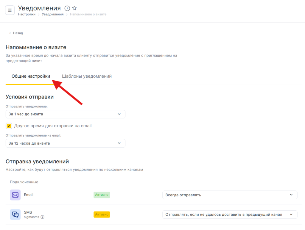 По умолчанию в настройках уведомления установлена отправка SMS за 1 час до визита и Email за 12 часов до визита. Если запись в журнале была создана до изменения настроек отправки уведомления, то для нее будут действовать настройки по умолчанию. Все изменения применяются только для будущих записей. При необходимости для созданных ранее записей время отправки можно изменить вручную в окне записи в разделе Уведомления.