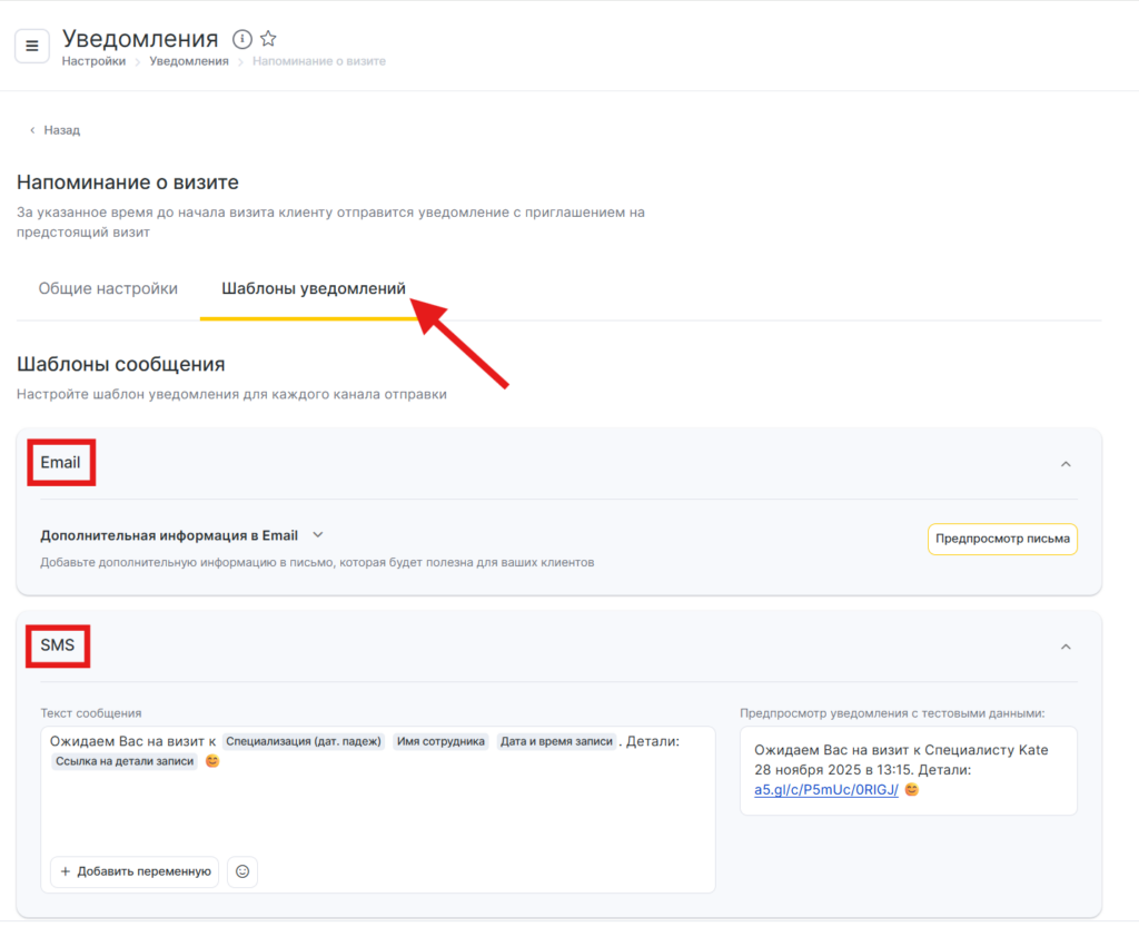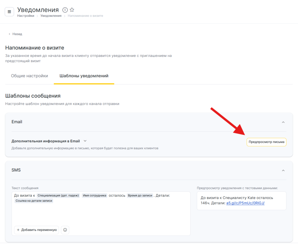 - Для всех шаблонов уведомлений доступен предпросмотр — как будет выглядеть сообщение при отправке клиенту, сотруднику или администратору, с учетом переменных.