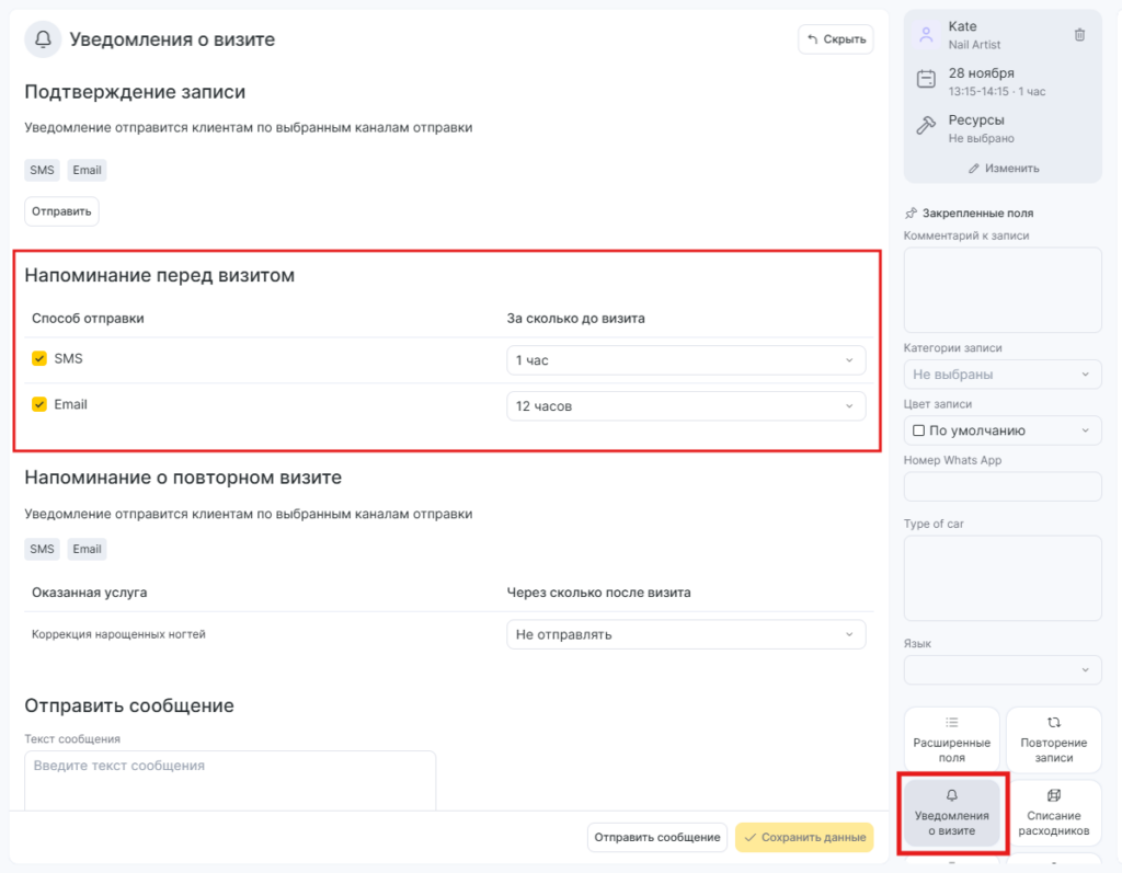 Также время отправки напоминания перед визитом можно установить индивидуально для каждого визита в окне записи в разделе Уведомления. Чтобы отключить отправку напоминания в визите уберите отметку с канала отправки.