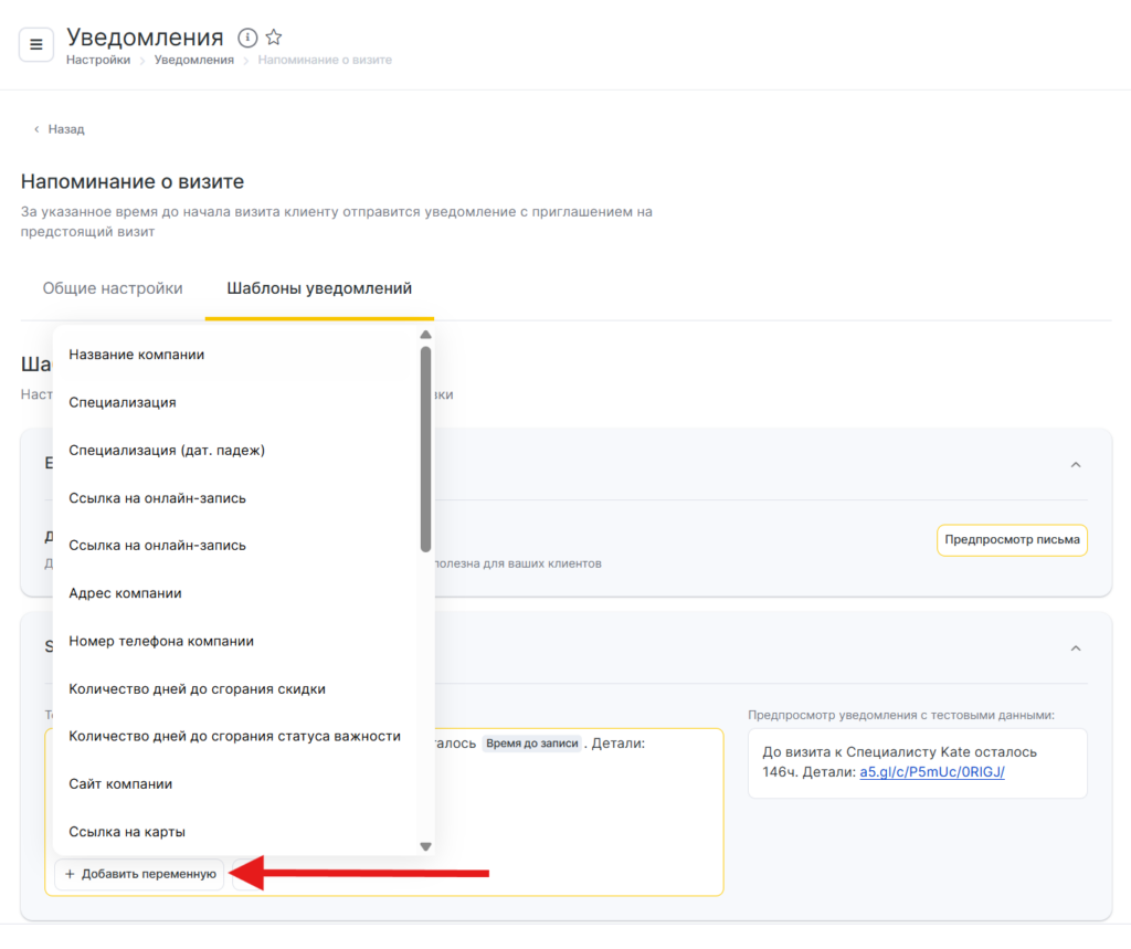 - Для настройки доступны переменные, вместо которых будут автоматически выводиться данные о визите, услуге, клиенте или филиале. Чтобы добавить переменную в шаблон, нажмите на кнопку Добавить переменную, затем выберите подходящую по смыслу. Список всех доступных переменных можно найти в статье.