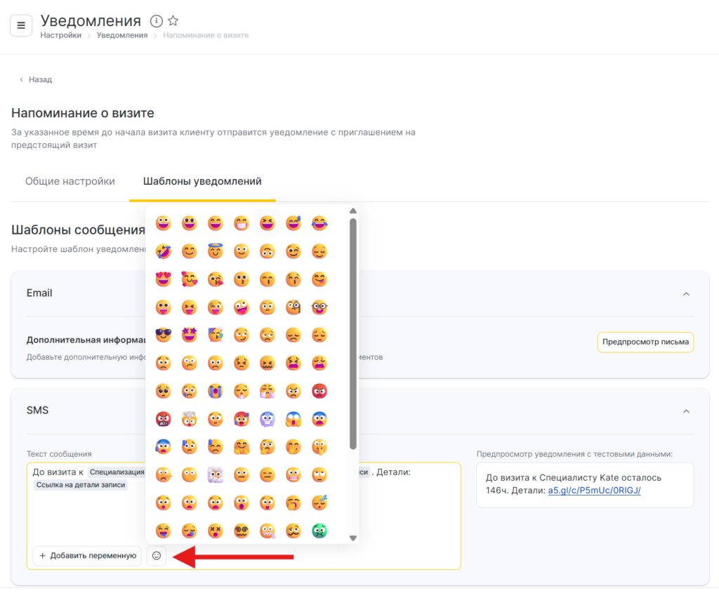 - В шаблонах уведомлений вы можете использовать Emoji смайлы, для этого нажмите на кнопку со смайлом и выберете нужный из предложенных или добавьте свой