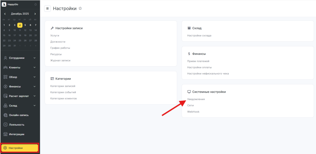 - Перейдите в основном меню в раздел Настройки > Системные настройки > Уведомления на вкладку Типы уведомлений.