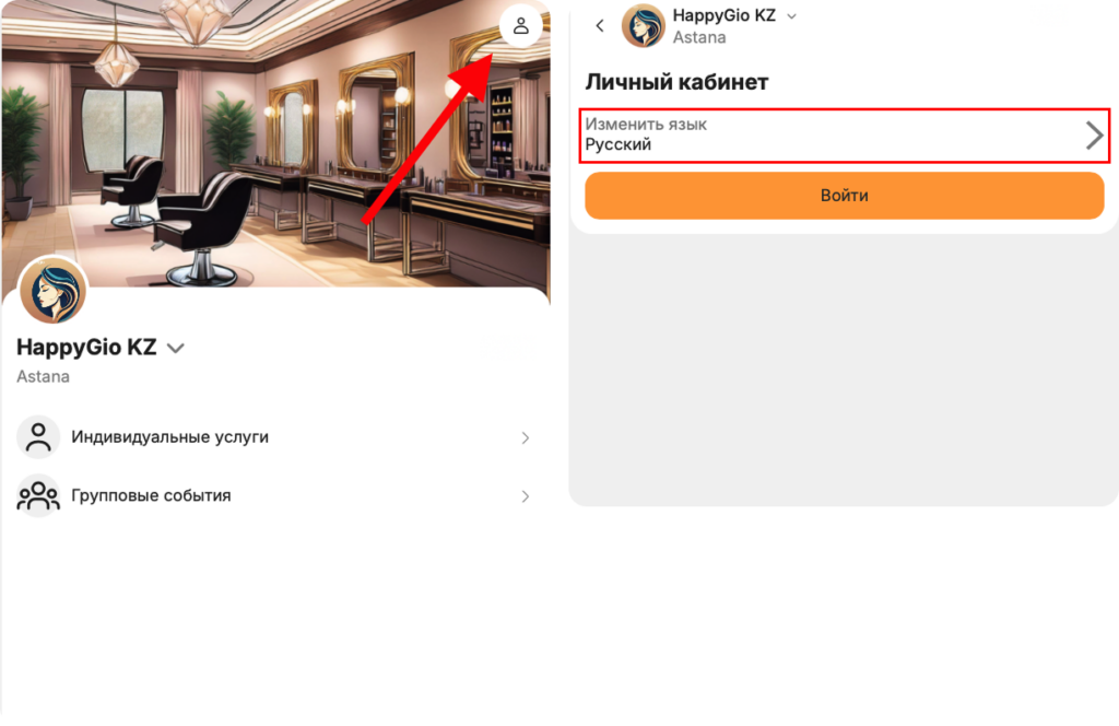 Возможность выбора языка есть и в самом виджете онлайн-записи. Для этого нужно перейти в ваш Личный кабинет, нажав на иконку профиля 👤 в правом верхнем углу экрана и нажать кнопку Изменить язык.