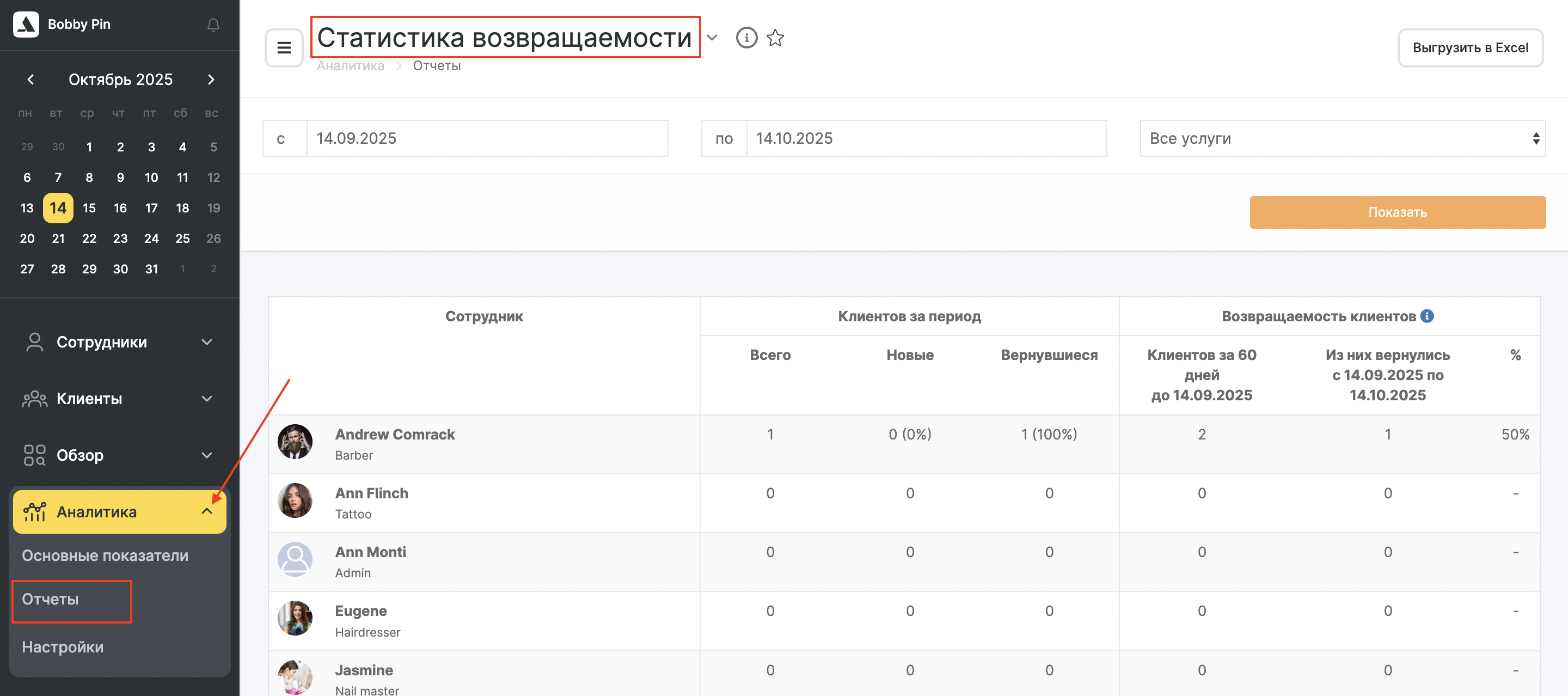 Раздел «Аналитика» > «Возвращаемость» показывает эффективность рабочего времени сотрудников и результаты их работы с клиентами.